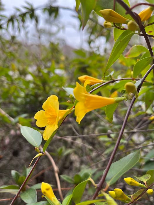 There’s a tree that’s native to the Carolinas called silverbells (Styrax americanus). There’s a little park across the street where we go for walks. I would smell this amazing flower smell and wonder, “What is it?” Finally, I found it. It was a little tree growing in the bushes on the riverbank with these little white flowers. It smelled incredible, and then I had to find out what this plant was. It took me a while, but I figured it out. There are other more common plants in our landscape. Carolina Jessamine (Gelsemium sempervirens) almost smells like cotton candy, and it’s about to bloom.
