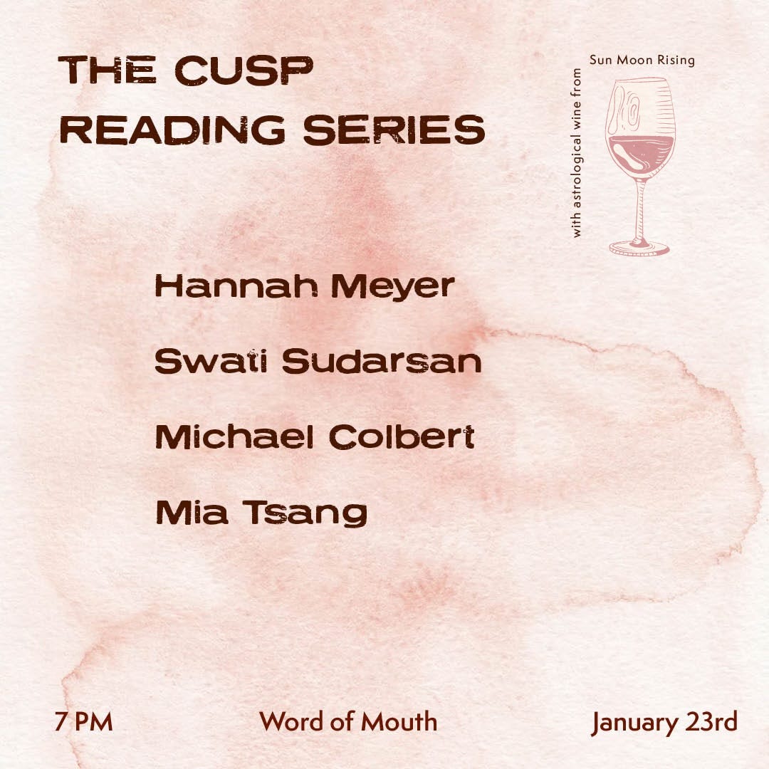 I’m reading in Brooklyn tonight! The Cusp is a new reading series launching at Word of Mouth, helmed by Emily Lowe and Summer Wrobel. I’ll be reading from my novel and would love to see you there.